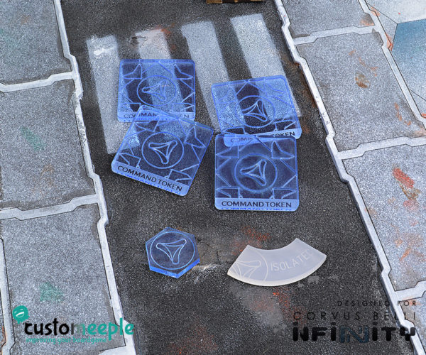 The Tokens are acrylic square pieces that can be engraved with a Faction/Sectorial logo of your choice. Knowing Customeeple, they can even help you make custom tokens.