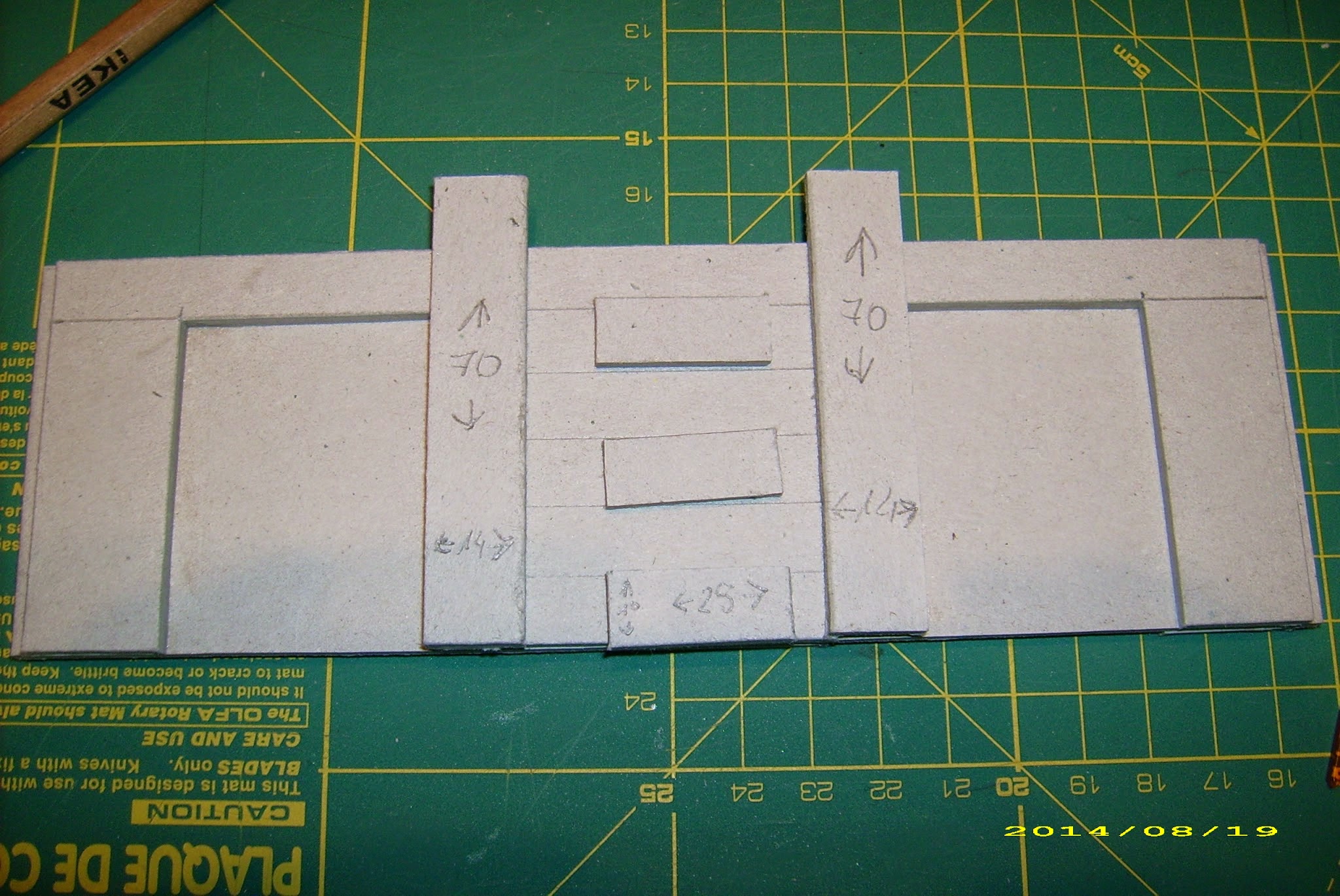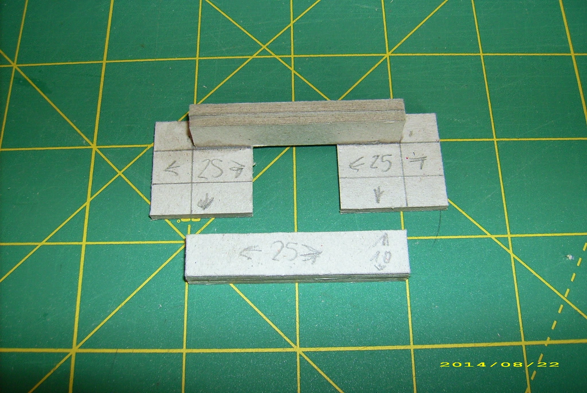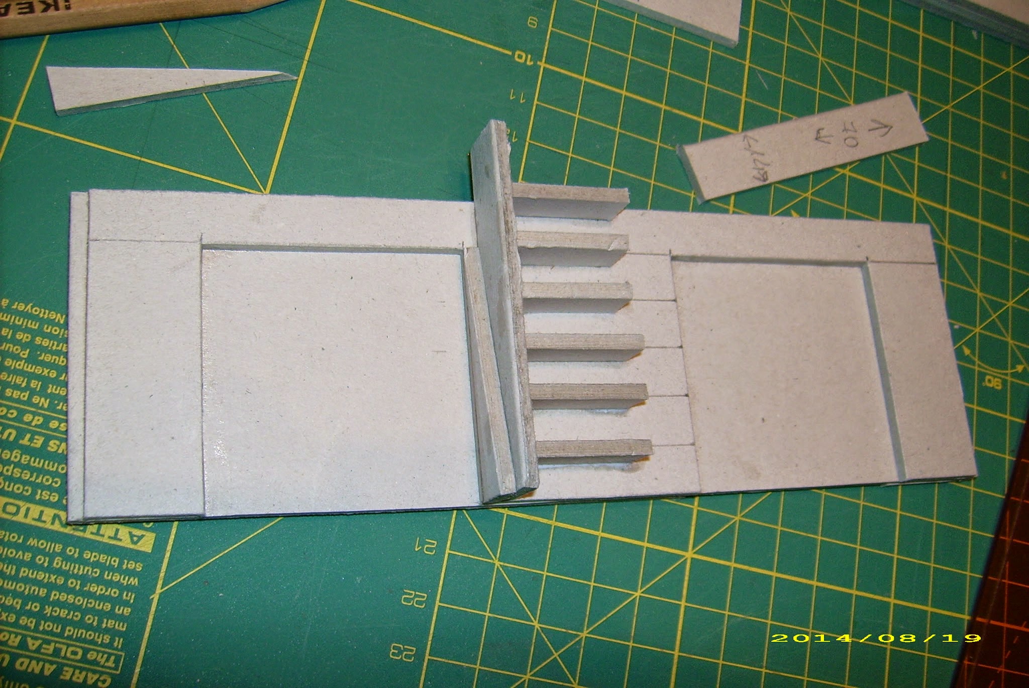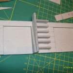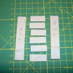 So – I cut another slab, 6mm more narrow but just as tall (patience, it will all get together in time), to glue it onto the basic one. Well, two of them – one of each side of the basic slab. Sure, slab on a slab is not much interesting, therefore I made up niches (50mm tall, 50mm wide) in the external slabs. Now, I could glue them together, and add supports. And I’ll get generous with these, I have loads of spare supports – each 50x50mm niche provides me with a material for 10 of these!