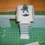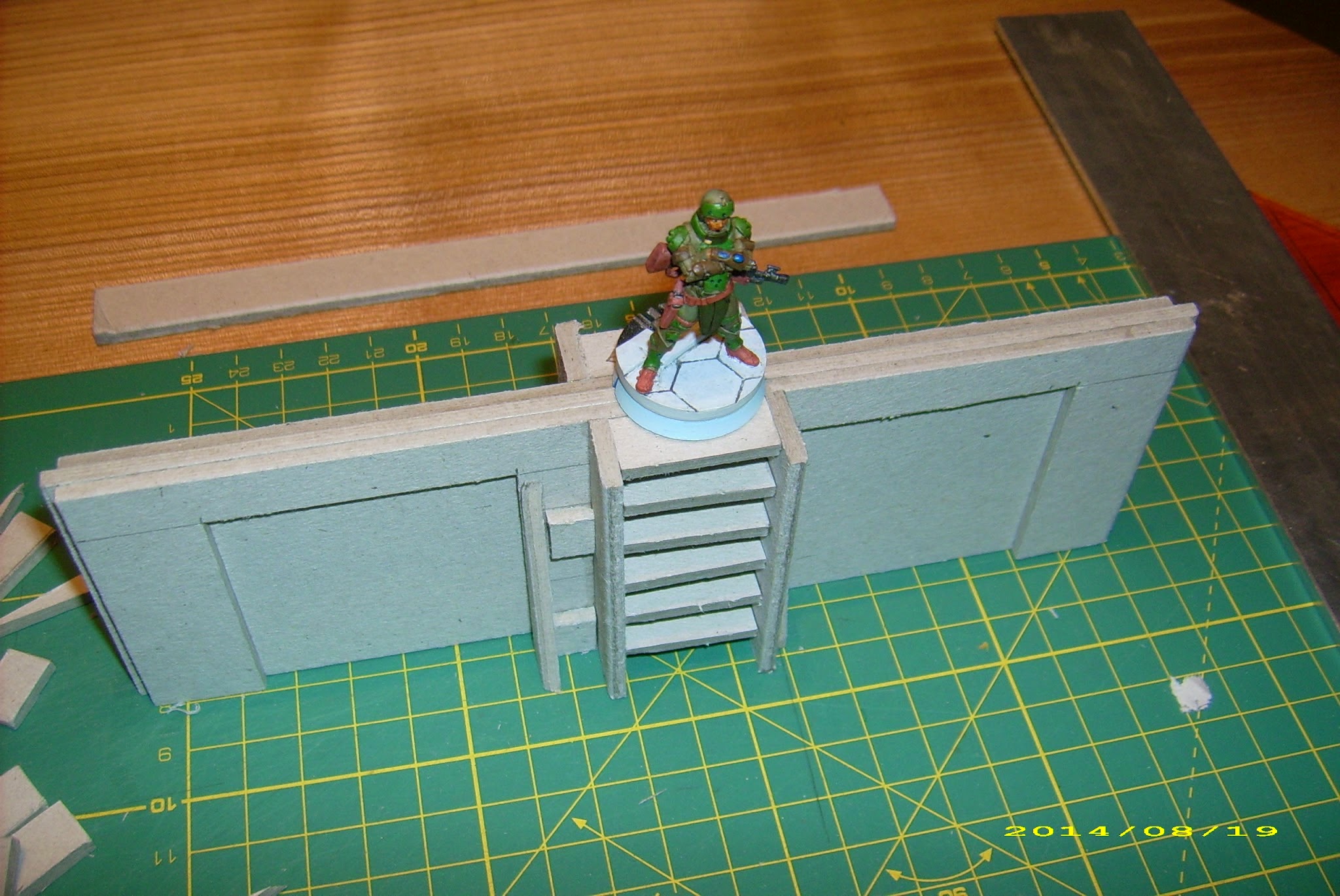 Take some side rails – mine are 70x14mm, just because they are made from leftover material (however, after I put it together, I realized that 70mm is way too tall, and the wall with ladder that high won’t fit inside of my objective room, so I had to cut them down… 60mm – the wall’s height – would’ve been perfect). Some 25 mm wide (figure base), 10mm deep steps. A buttress on one side is glued to a side rail, on the other I needed to custom fit small pieces that on the basic walls were 40mm beams helping the buttresses sit straight.