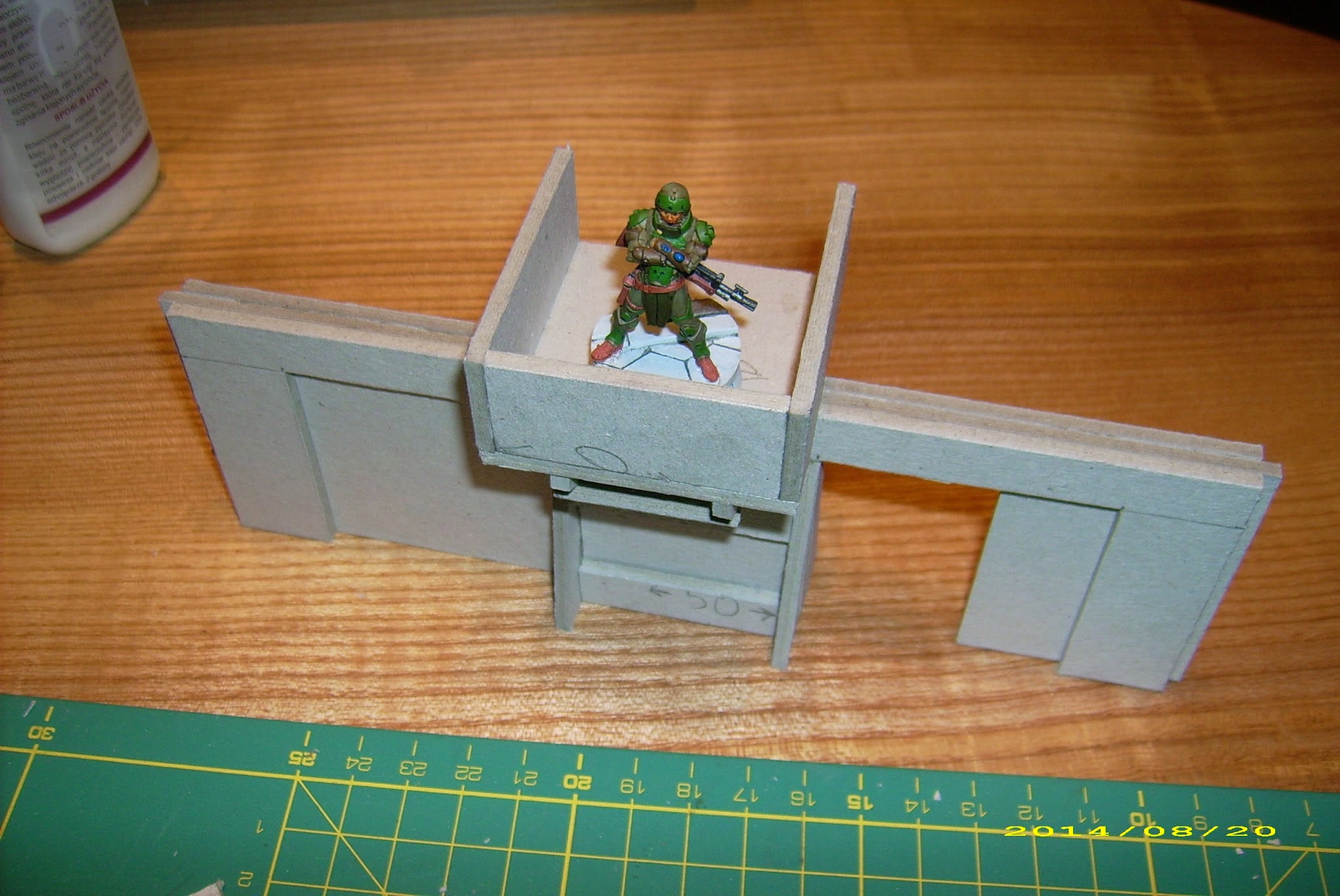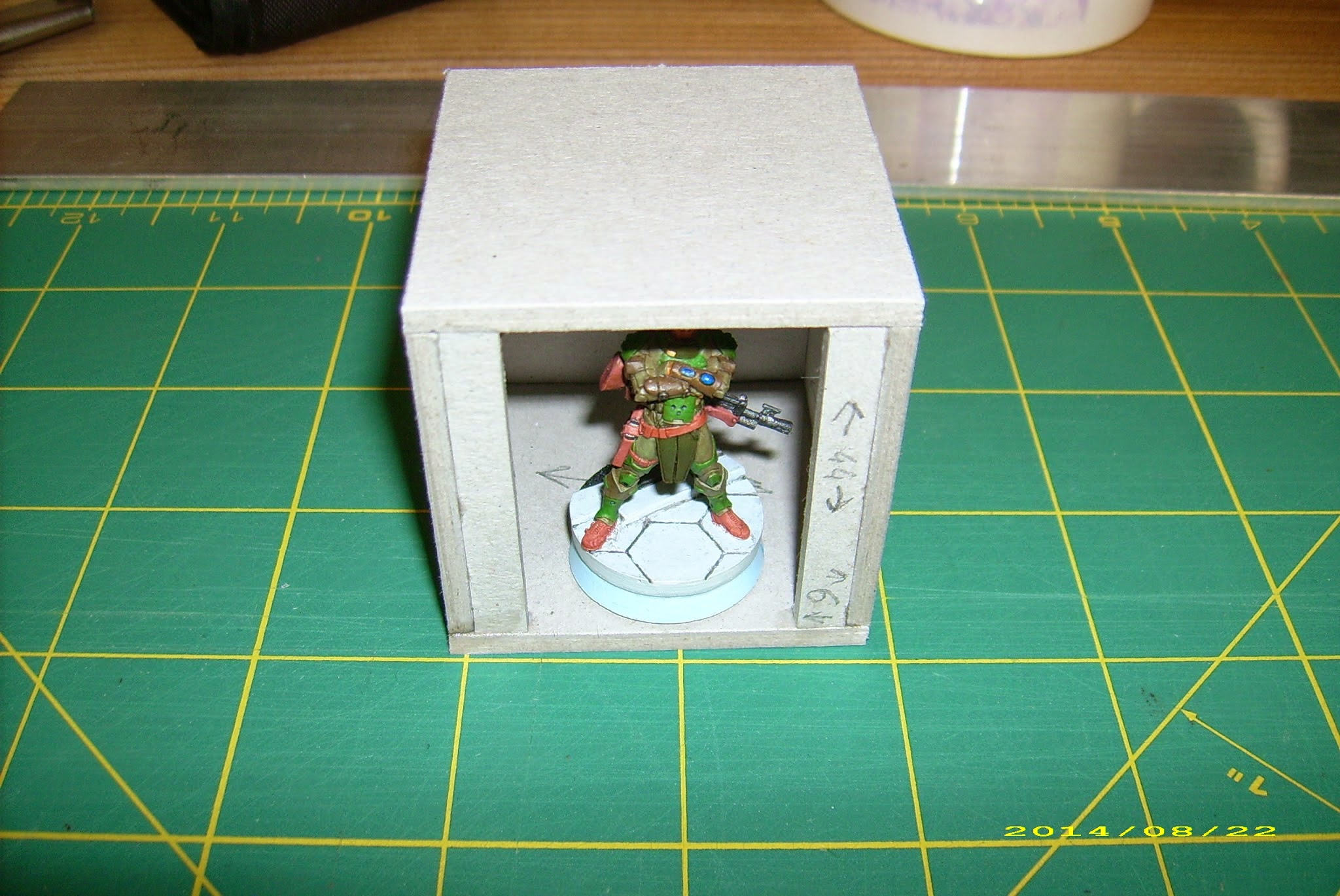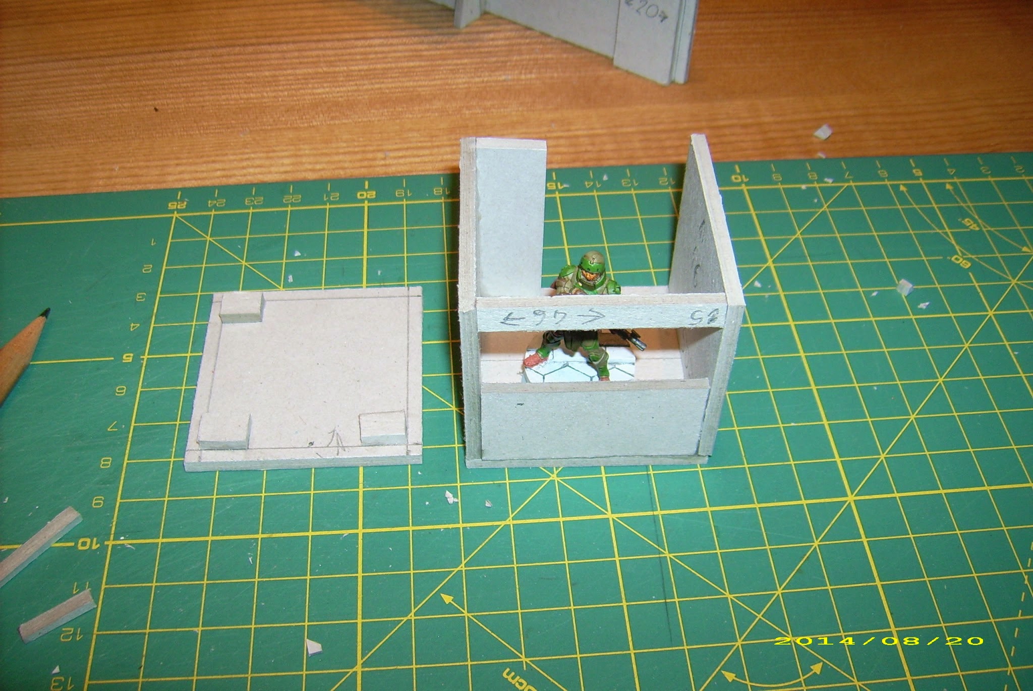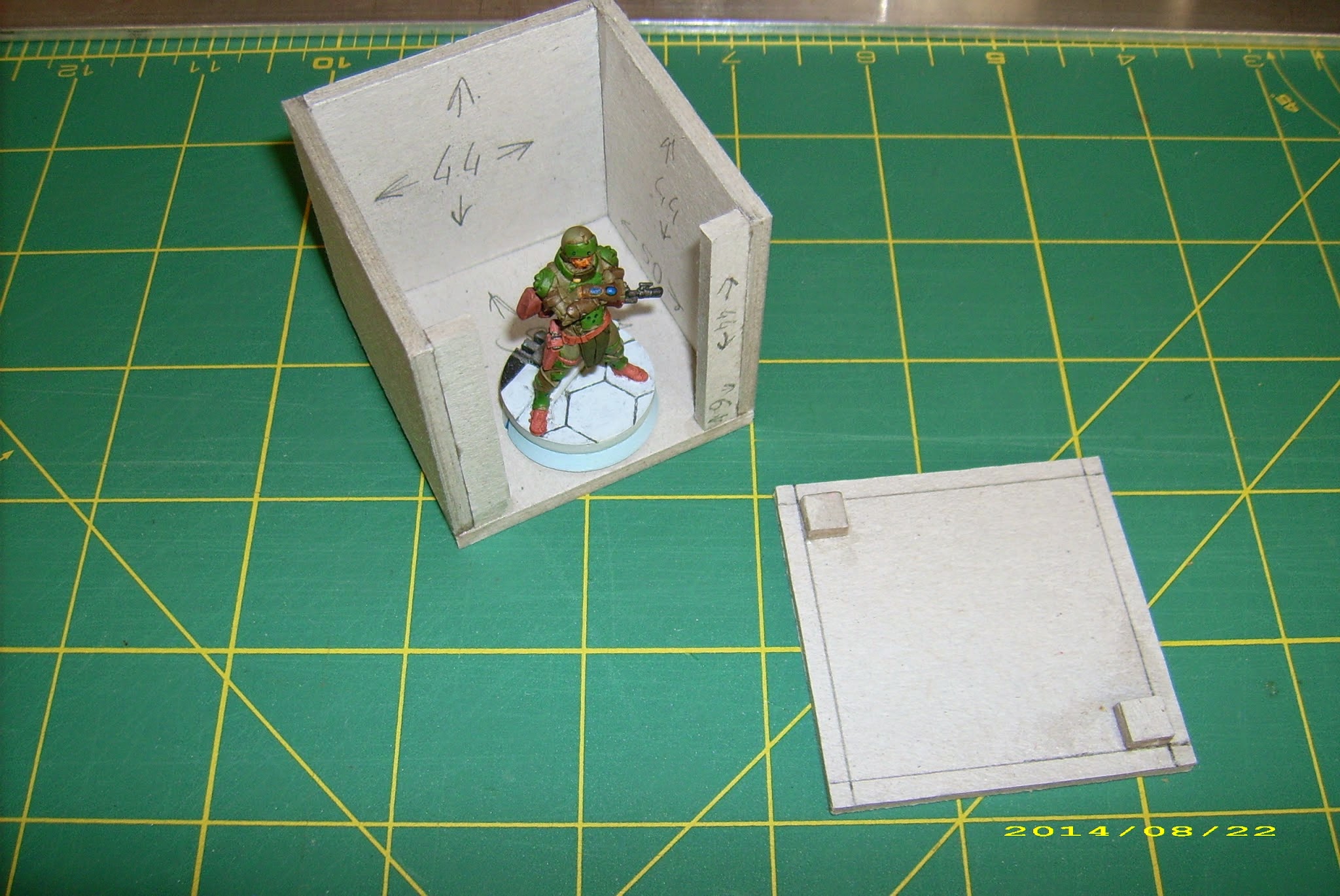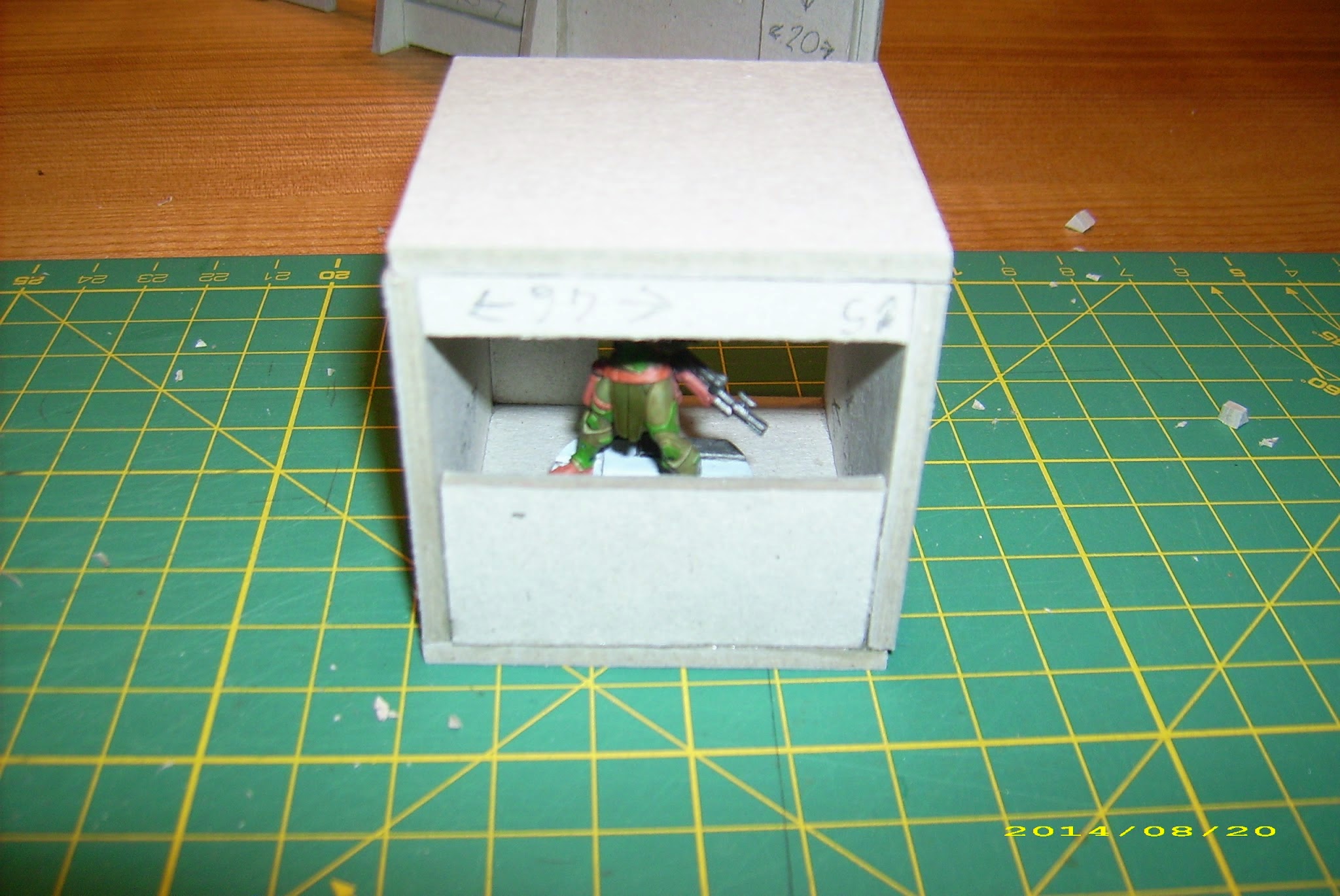 Third, and not least important, this is a little less than internal space of the objective room I showed you in Cardbuilding #1, and I want the walls to fit inside. Having limited space to store my terrain, it is better to keep that in mind, and plan your terrain to stack together.