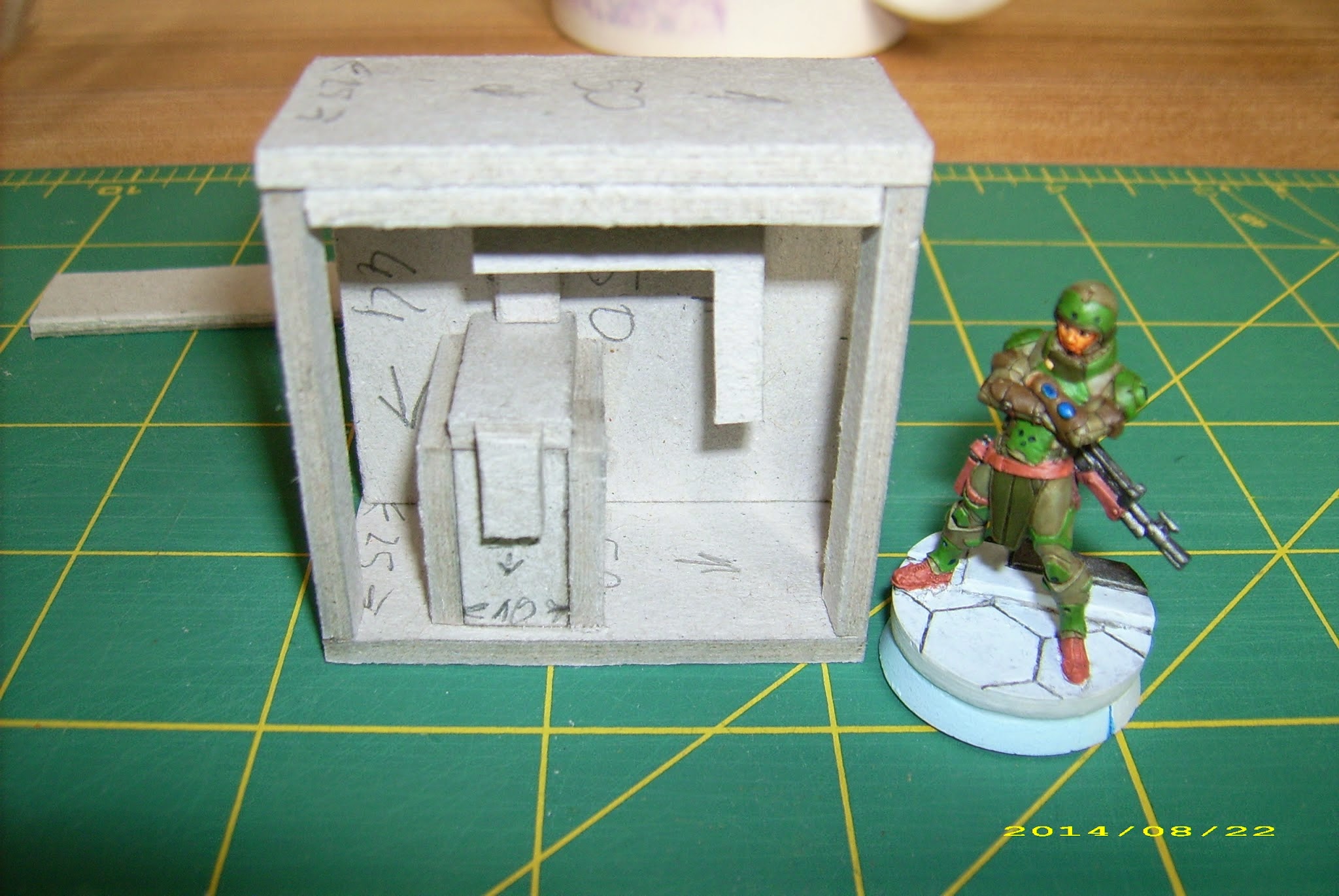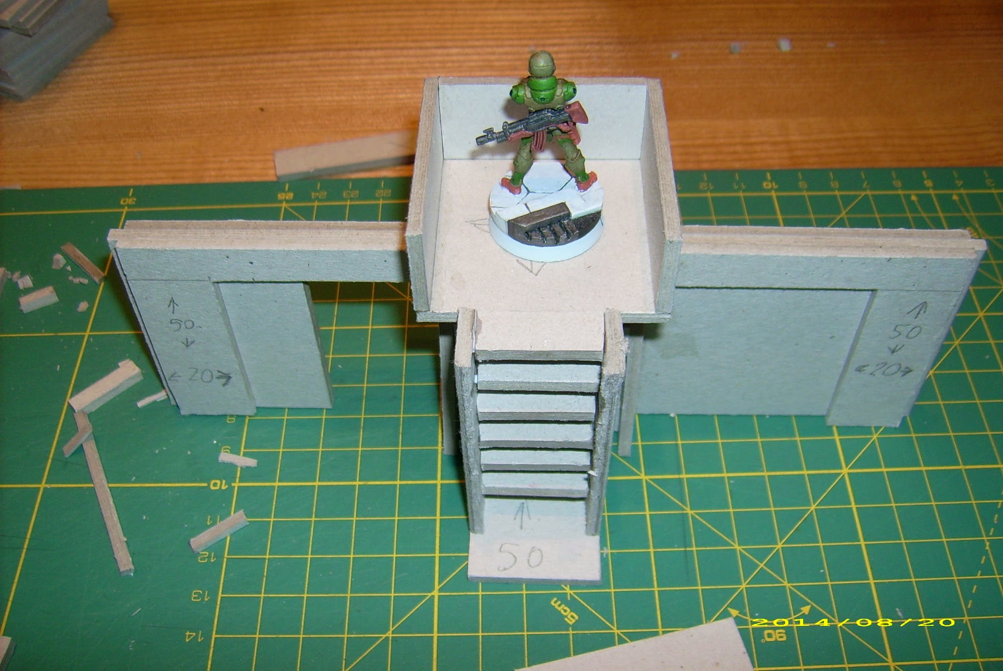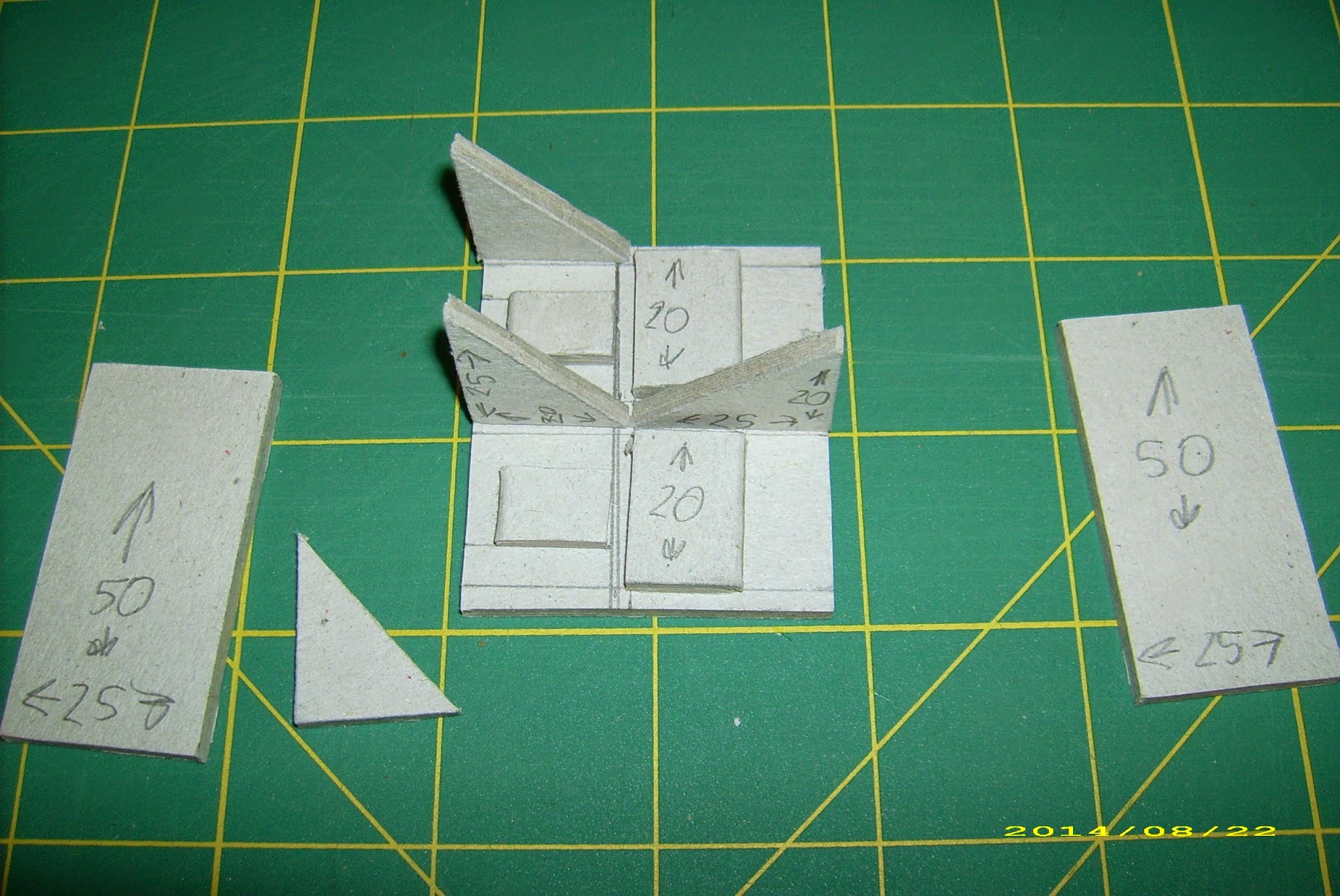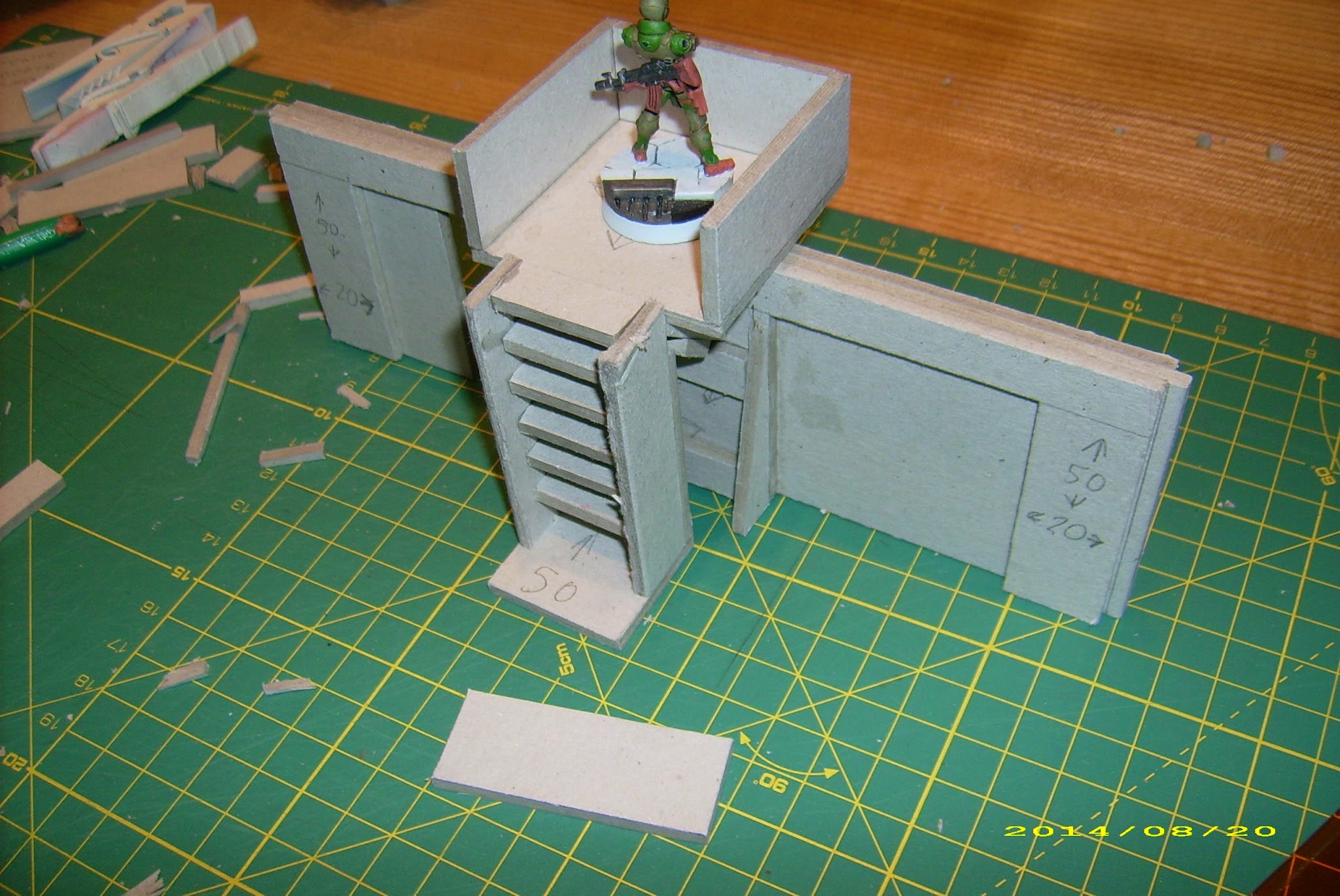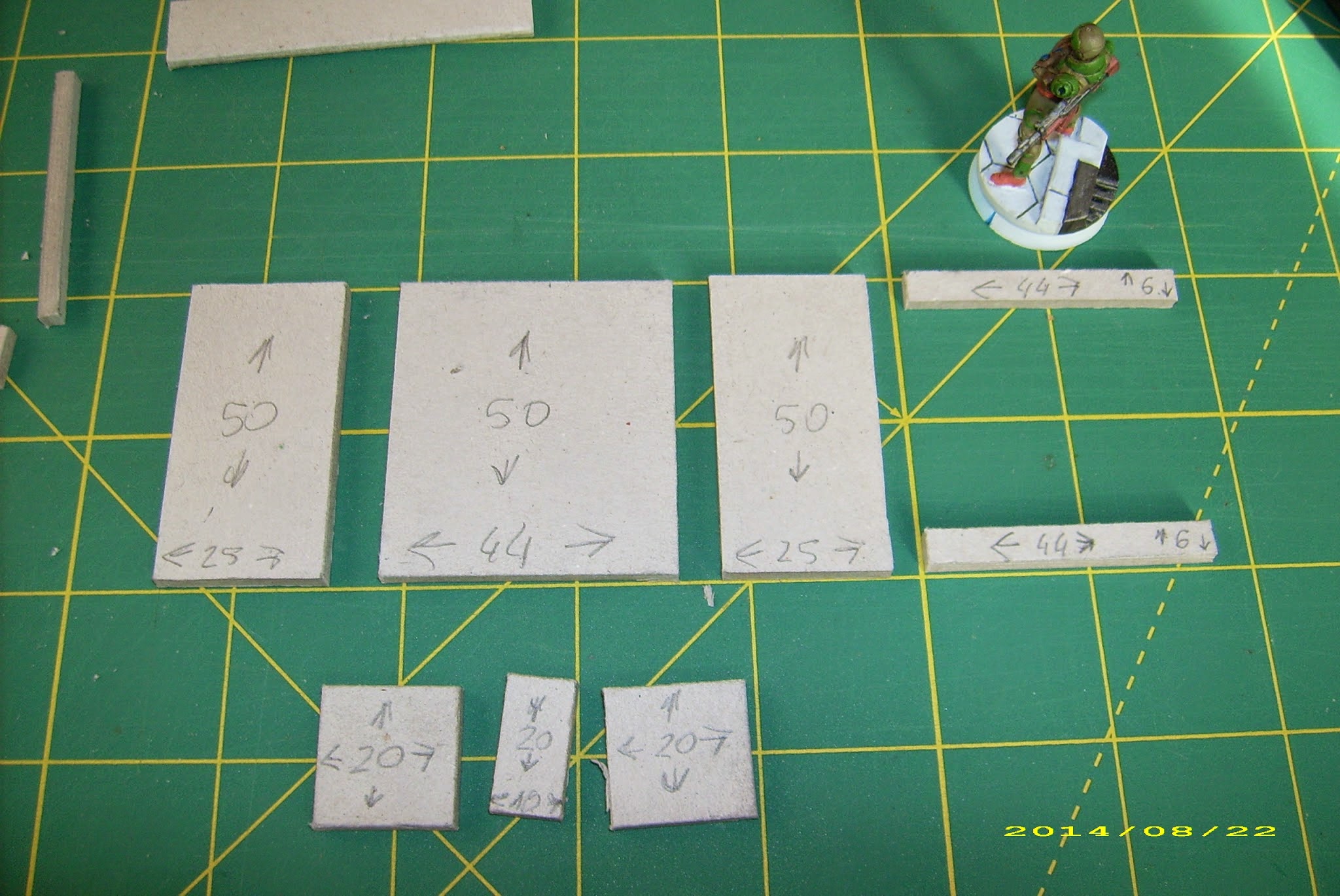 A 50x50mm slab as a base, and another as a roof. Two more to serve as side walls – just cut them down (and I messed up that one, so don’t mind the dimensions on the picture – it should have been 44mm tall, not 46mm), one 30mm wide, 44mm tall to form rear wall (and leave some room for the entrance). Front is a 44mm wide, 20mm tall bottom and 44mm wide, 3mm upper beam.