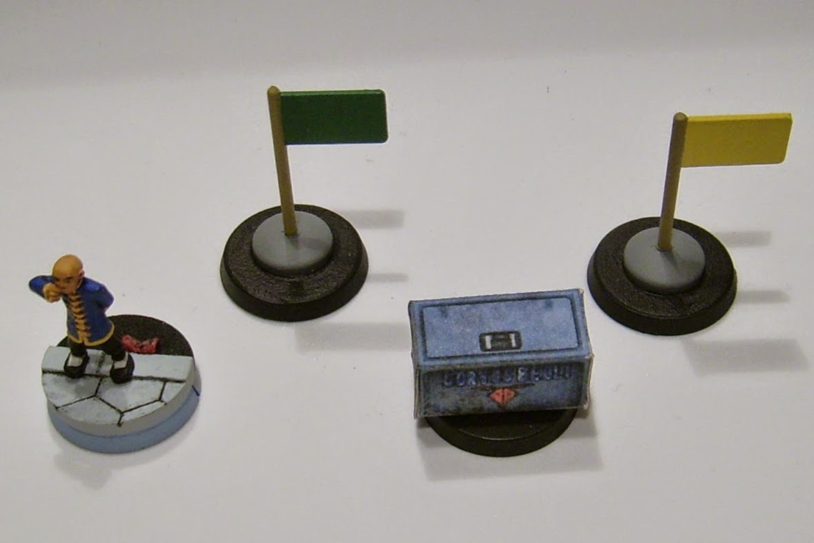 Crate and Civvie are placed on the central line of the table, in random distances from the respective side edges. The flags are deployed with the player’s main deployment.